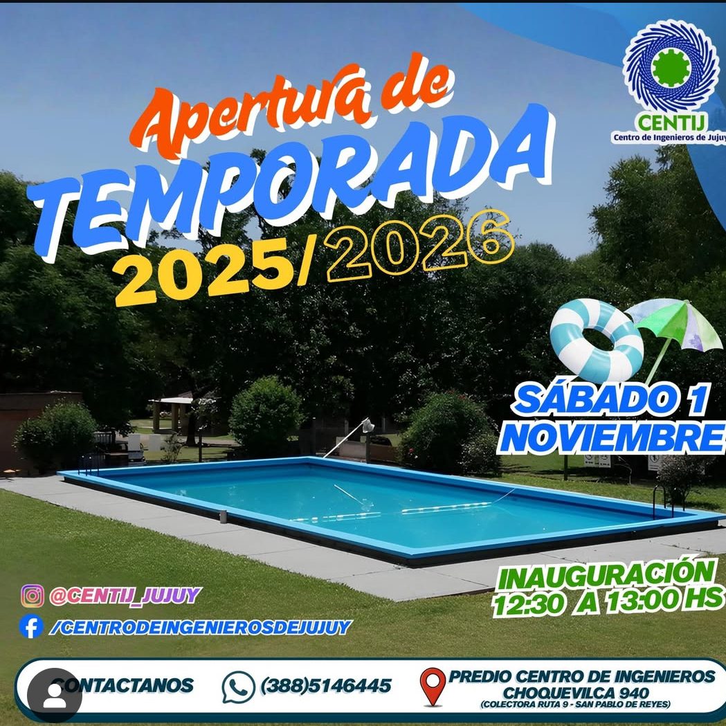 Trae la malla,el protector y la mejor onda, porque en el Centro de Ingenieros de Jujuy arrancamos la temporada de verano 2025/2026 el sábado 1 de noviembre de 2025 a las 12:30.
