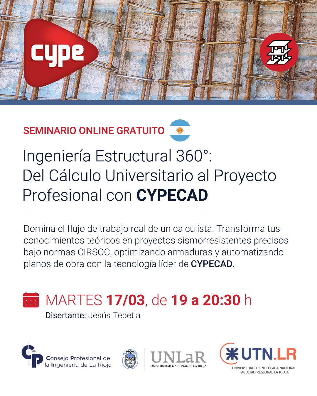 «Ingeniería Estructural 360°: Del Cálculo Universitario al Proyecto Profesional con CYPECAD» Fecha: 17/03/2026 Hora: 12:00 AM Calendario: COLEGIO DE INGENIEROS https://capacitaciononline.webex.com/webappng/sites/capacitaciononline/meeting/register/9bce0f37d4e24e56abde269754b9f2fb?ticket=4832534b0000000865bd92438565b3fa57475ad6ddd5d5e1e1d78bfac3092c063c7c3ab97bd275e4×tamp=1773659240131&RGID=r0b44c4923d29f2e7a0dd4d77bf0de36b&isAutoPopRegisterForm=false