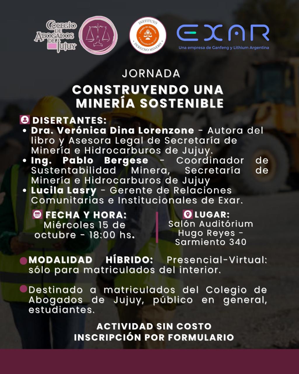 JORNADA»CONSTRUYENDO UNA MINERIA SUSTENTABLE» Fecha: 15/10/2025 Hora: Todo el día Calendario: COLEGIO DE INGENIEROS Construyendo una mineria sostenible,Enlace de inscripción: https://forms.gle/xToNF12rZxHqqwXaA