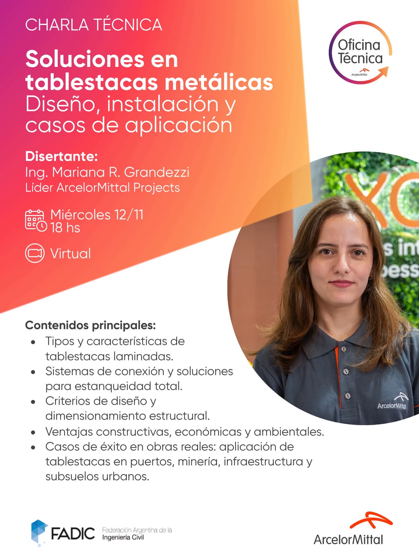 Diserta: Ing. Mariana R. Grandezzi – Ingeniera estructural con más de 10 años de experiencia en proyectos de contención y fundaciones metálicas. Graduada en la Universidad Presbiteriana Mackenzie, con especialización en estructuras metálicas, actualmente lidera un equipo en ArcelorMittal Projects, desarrollando soluciones para puertos, saneamiento, minería, edificaciones y otras áreas de infraestructura.