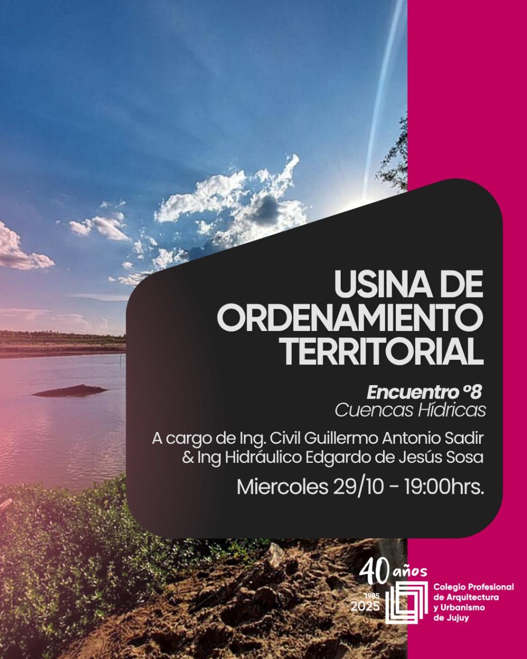 Este miércoles 29/10 a las 19 horas en el Colegio de Arquitectos, te invitamos a participar de un nuevo encuentro,a cargo del Ing.Civil Guillermo Sadir y el Ing. Hidráulico Edgardo de Jesús Sosa, quienes compartirán su experiencia en la gestión y planificación del recurso hidrico en la provincia.