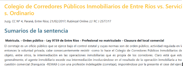 Sentencia por ejercicio ilegal de la profesión de un Corredor Inmobiliario. Colegio de Corredores Públicos Inmobiliarios de Entre Ríos vs. Servicios y Comercializadora Alameda S.R.L. y otros s. Ordinario /// Juzg. CC Nº 4, Paraná, Entre Ríos; 21/02/2017; Rubinzal Online; 21691; RC J 2577/17